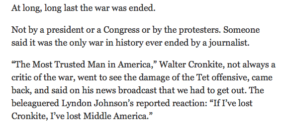 “‘The Most Trusted Man in America,’ Walter Cronkite, not always a critic of the war, went to see the damage of the Tet offensive, came back, and said on his news broadcast that we had to get out. The beleaguered Lyndon Johnson’s reported reaction: ‘If I’ve lost Cronkite, I’ve lost Middle America.'”